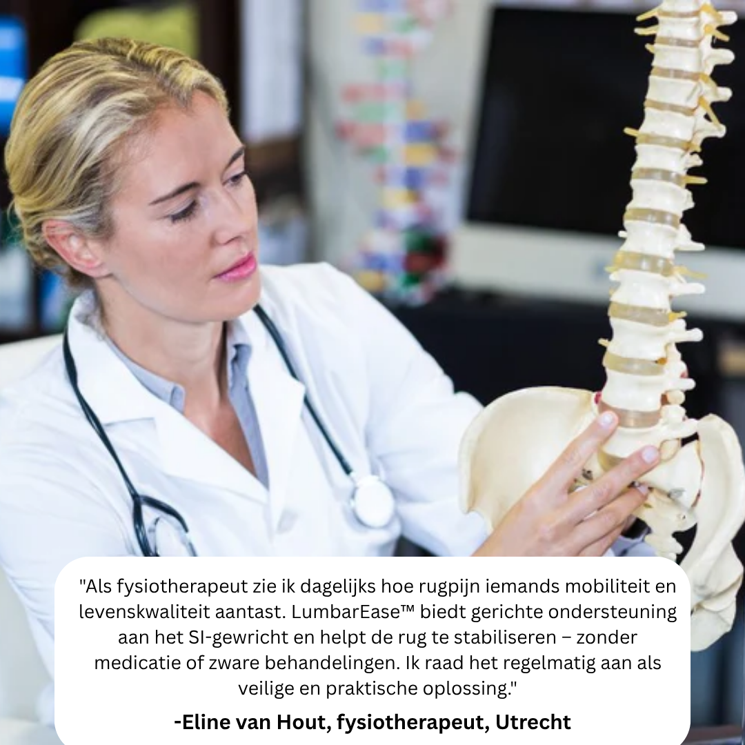 De meeste rugklachten komen niet uit de spieren, maar vanuit het SI-gewricht en de onderste wervel L5 – plekken die je met zalfjes of standaard oefeningen niet goed bereikt. LumbarEase™ is ontworpen om daar gericht druk op uit te oefenen met dubbele compressietechnologie.